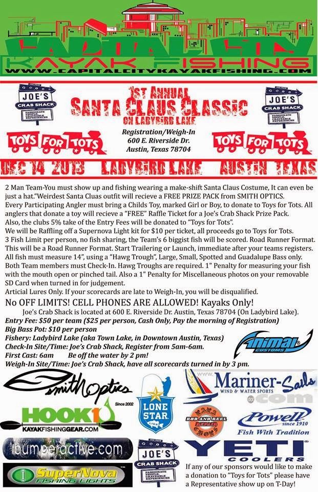Santa Claus knocked me out. More specifically, The First Annual Santa Claus Classic. I'll have a full tourney report later next week for Cap City Kayak Fishing but for now, here is my story.